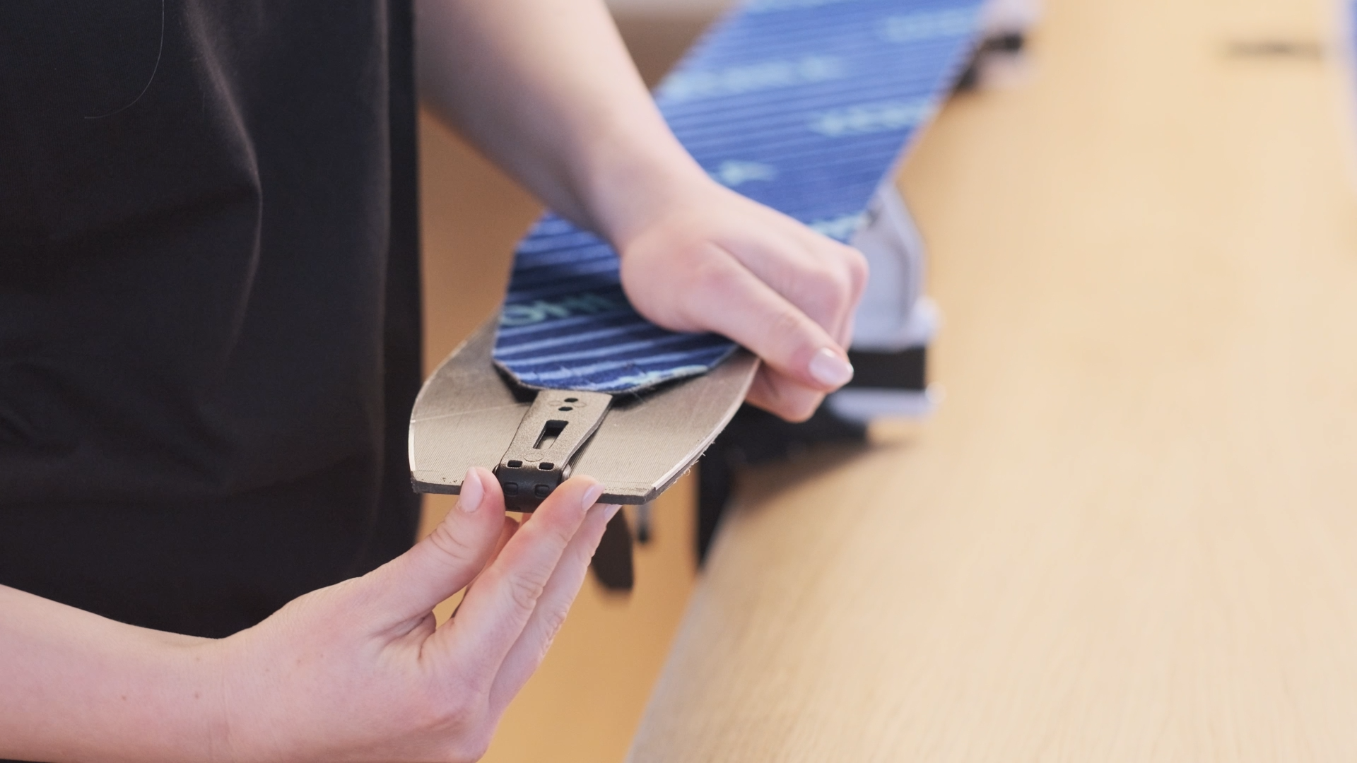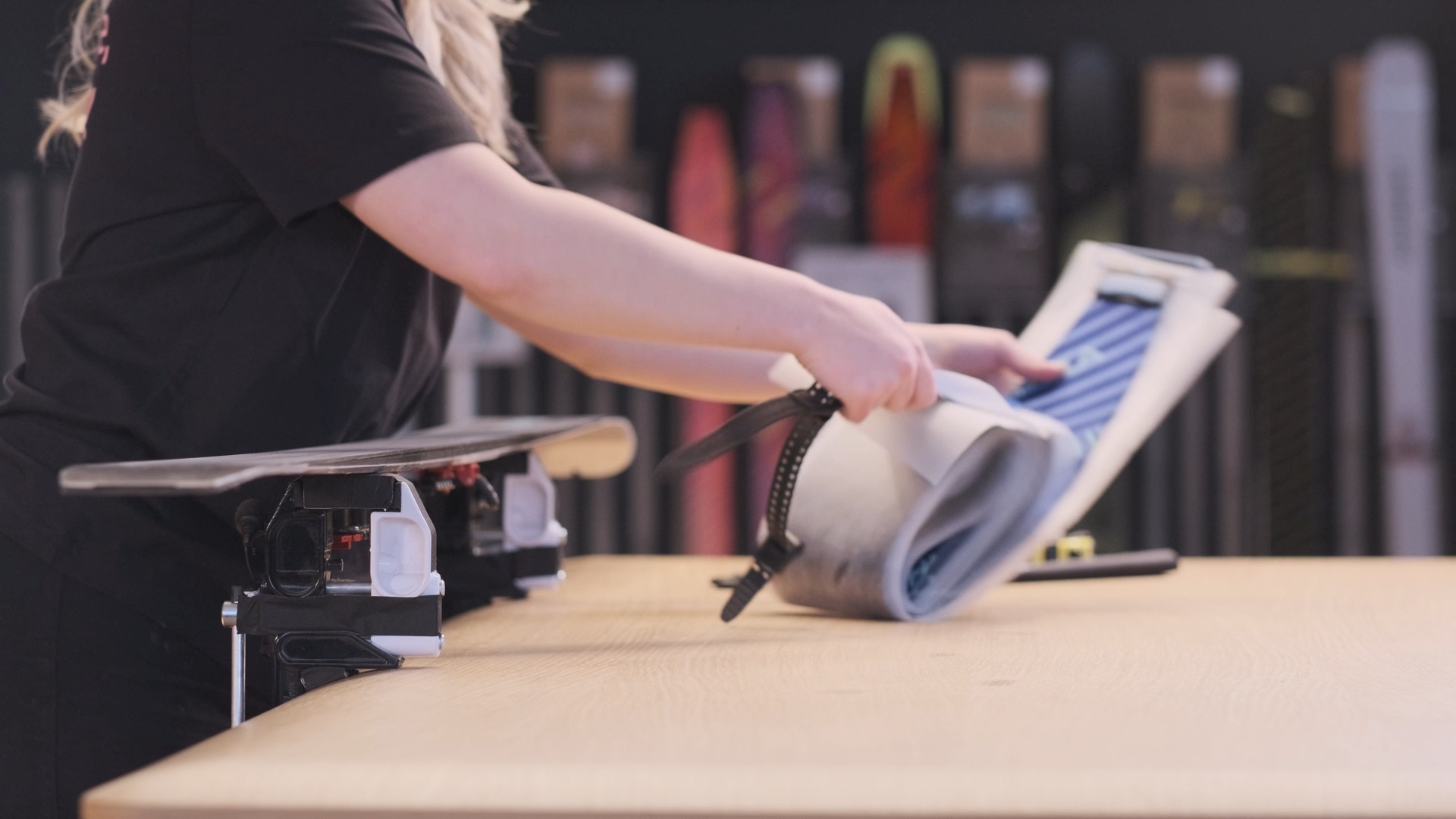 Benutzte für jeden Schnitt eine frische Klinge, um einen optimales Ergebnis zu gewährleisten. Das Gleiche wiederholst du nun noch einmal auf der anderen Seite des Steigfells. Passe auch darauf auf, dass du beim Schneiden entlang der Kante mit dem Messer nicht versehentlich den Belag deines Tourenskis beschädigst.