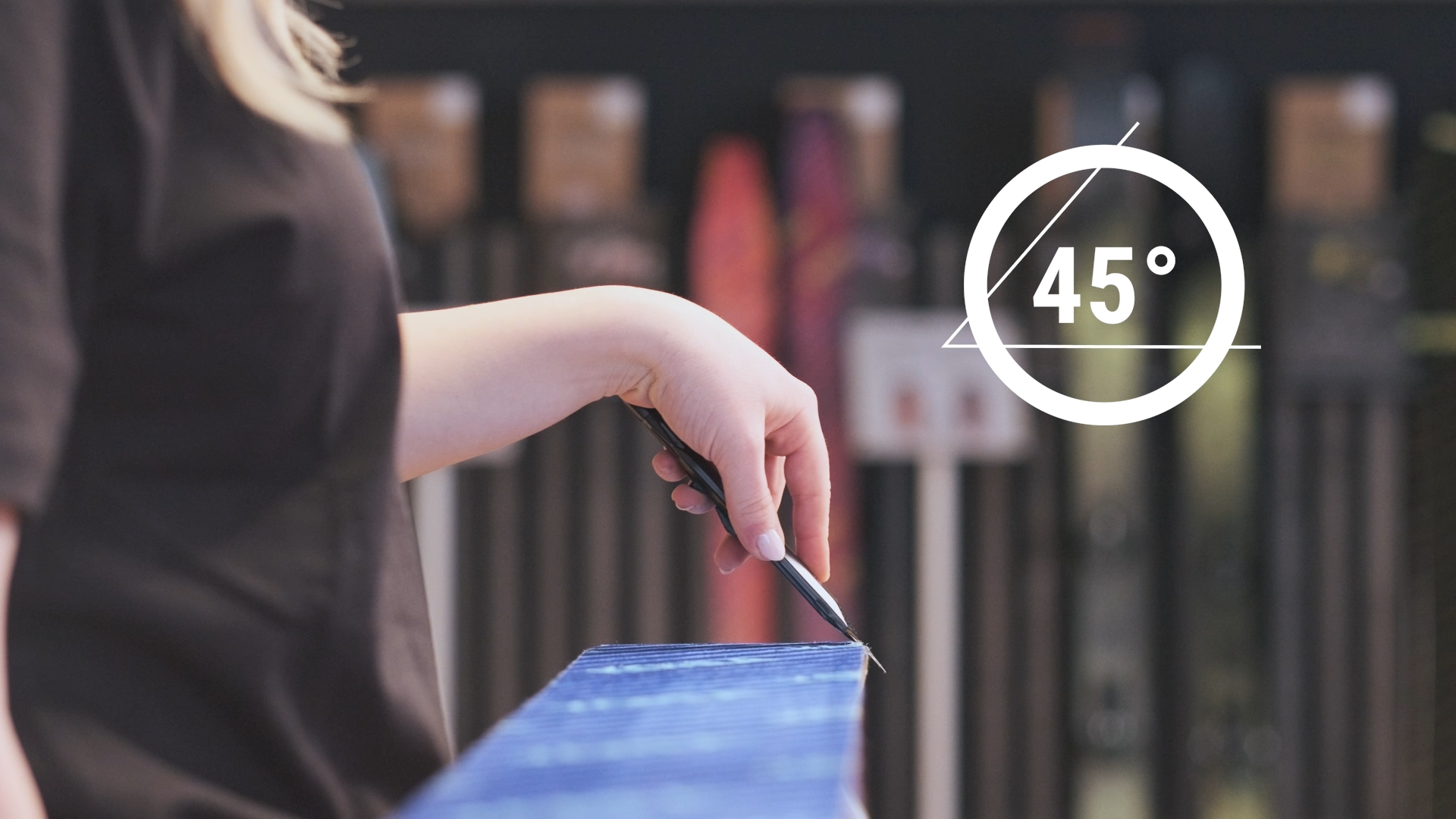 Nimm das Cutter-Messer und fahre die Klinge auf eine Länge von 2 bis 3 cm aus. Beginne beim Ski von vorn nach hinten mit der Laufrichtung des Felles zu schneiden. Wenn du gegen die Laufrichtung schneidest, kann das Skitourenfell irreparabel beschädigt werden. Setzte das Messer ein paar Zentimeter vor dem ersten Fellkontakt auf der Kante an. Halte es in einem 45° Winkel und schneide in einem Zug entlang der Skikante. Das ist wichtig, damit das Tourenskifell nicht über die Kante ragt. Die Kante muss frei bleiben, damit sie dir beim Aufstieg auf der Skitour seitlichen Halt liefern kann.