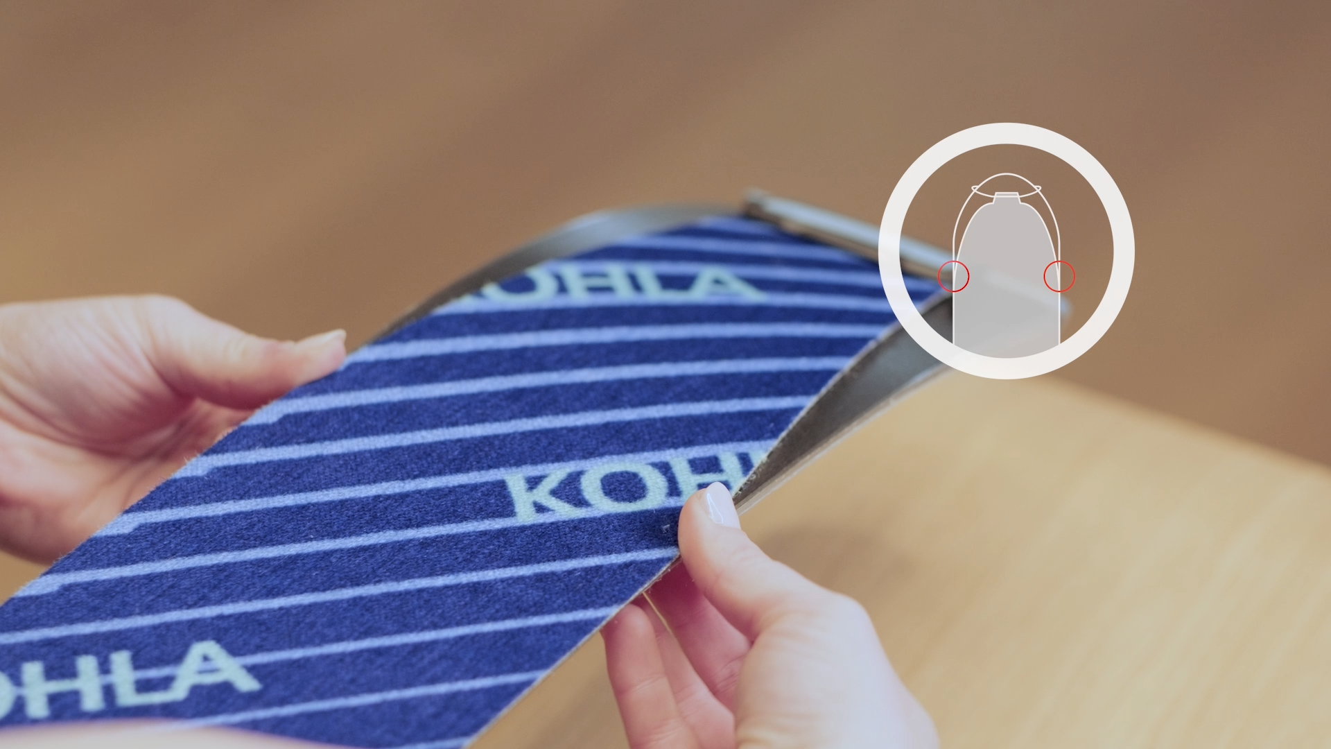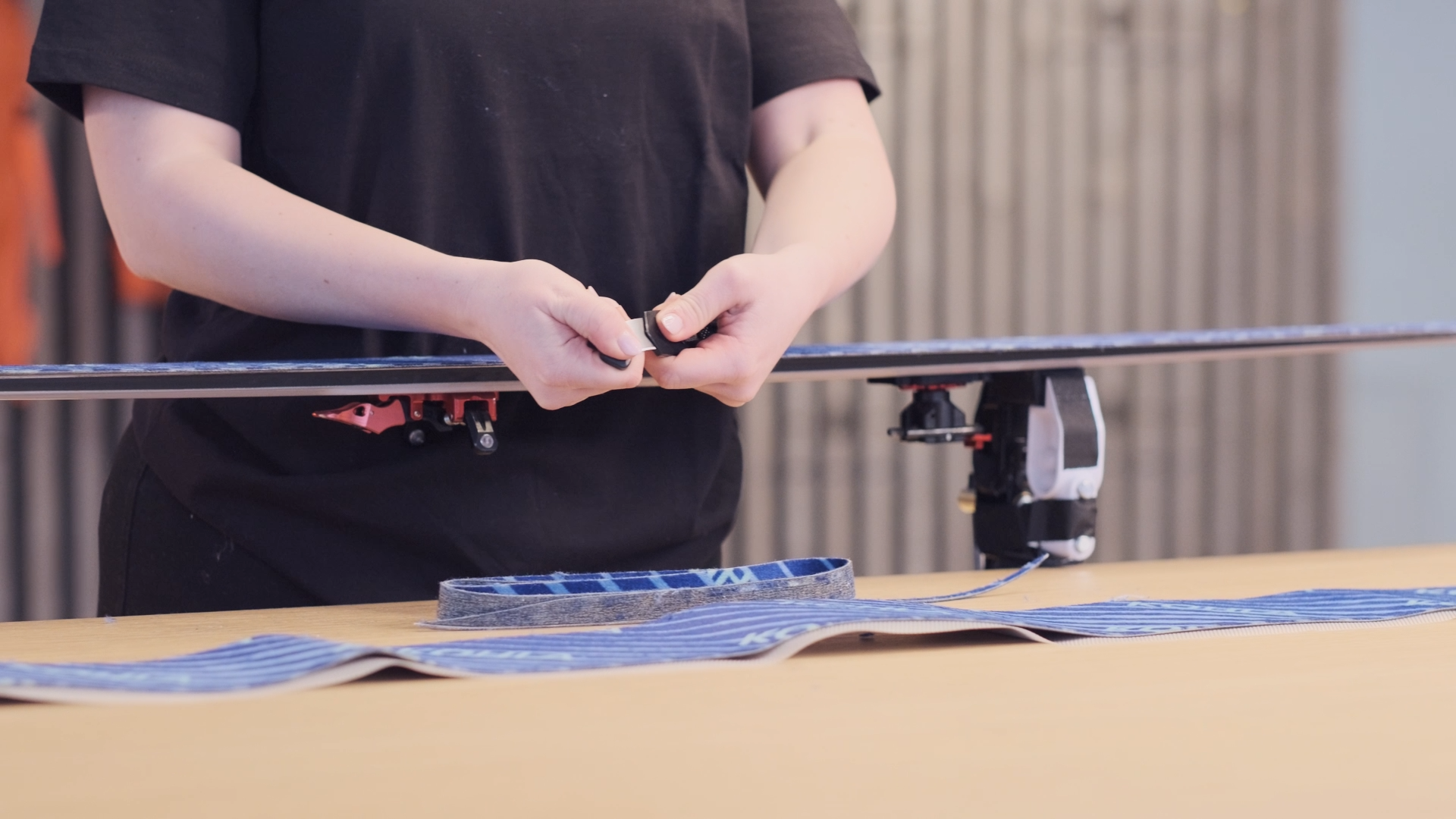 Als nächstes wird die Befestigung, der KOHLA Elastic Strap mit dem K-Clip, an den Tourenski oder an das Splitboard angepasst. Zieh den Elastic Strap so fest an, dass das Skitourenfell leicht auf Zug ist, wenn der K-Clip „einrastet“. Streiche das Steigfell anschließend noch einmal glatt und stelle sicher dass es flächig aufliegt.