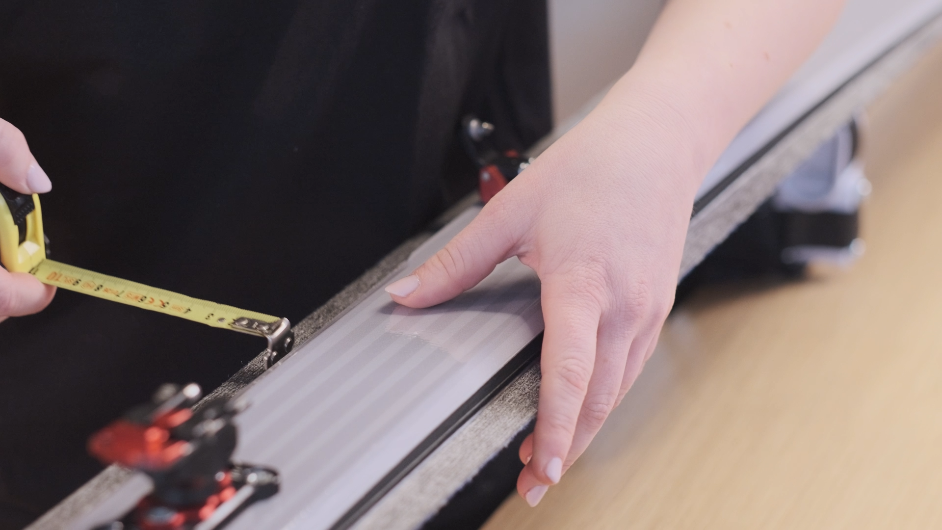Ob dein Fell ist perfekt positioniert ist kannst du kontrollieren, indem du den Ski umdrehst und mit einem Lineal den Abstand von der Kante des Ski zur Fellkante auf beiden Seiten nachmisst. Die sollten bestenfalls übereinstimmen. Falls eine Abweichung besteht, korrigierst du die Positionierung des Felles, solange bis die Abstände gleich sind.